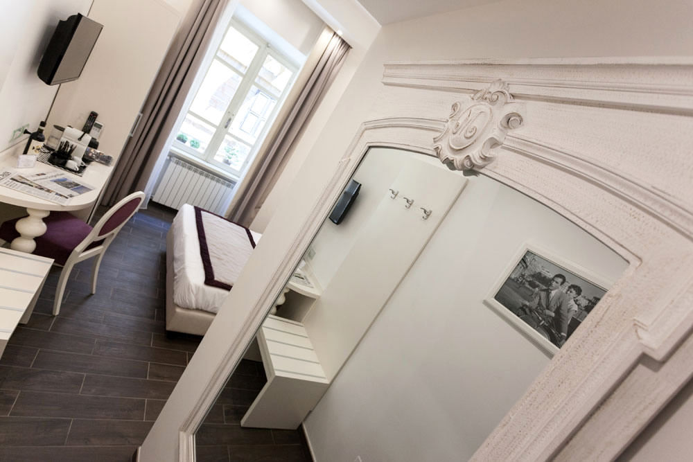 Relais Monti nasce a pochi passi dal Colosseo e da I Fori Imperiali situato in una delle zone piu chic di Roma le nuovissime 11 suite di cui e dotato nascono dall’esigenza della proprietà nel dare un tocco di classe a tutta la struttura con materiali laccati ad acqua testiere inbottite capitone’ incorniciate da masselli di legno di frassino con particolari esclusivi come le gambe tornite degli scrittoi sempre in legno di frassino e non ultimo pelli e tessuti di altissima qualità offrono alla propria clientela unsoggiorno raffinato ed esclusivo.